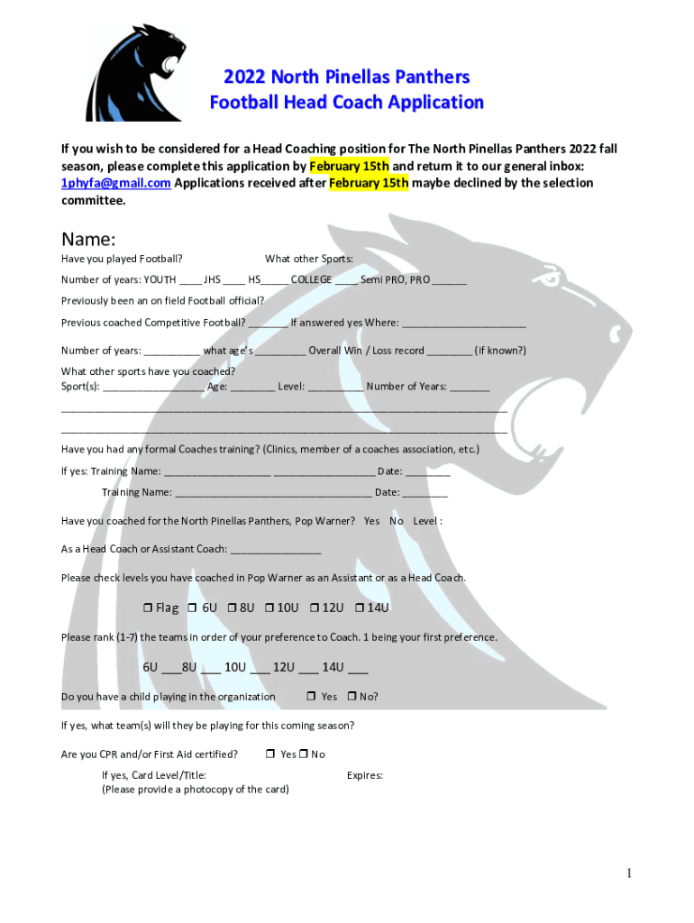 2022 North Pinellas Panthers Football Head Coach Application If you wish to be considered for a Head Coaching position for The North Pinellas Panthers 2022 fall season, please complete this application