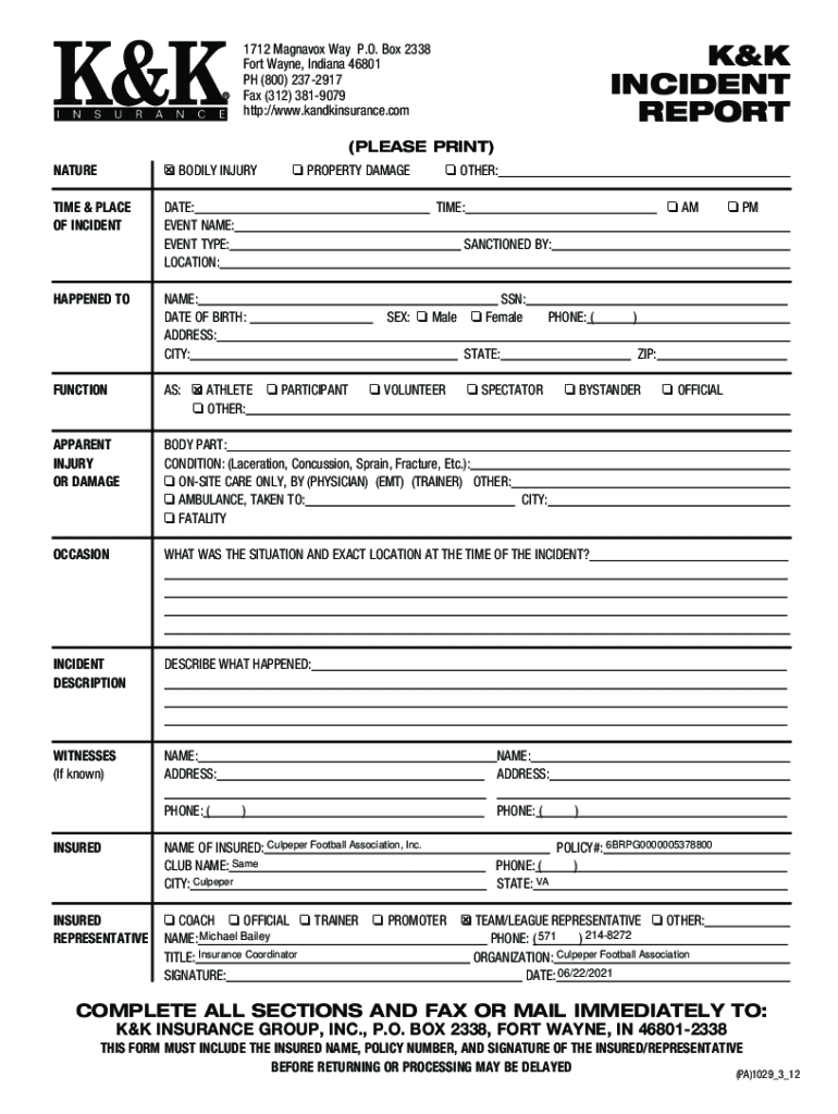 K&K INCIDENT REPORT1712 Magnate Way P.O. Box 2338 Fort Wayne, Indiana 46801 PH (800) 2372917 Fax (312) 3819079 http://www.kandkinsurance.com(PLEASE PRINT) Nature BODILY INJURY TIME & PLACE INCIDENTAL: