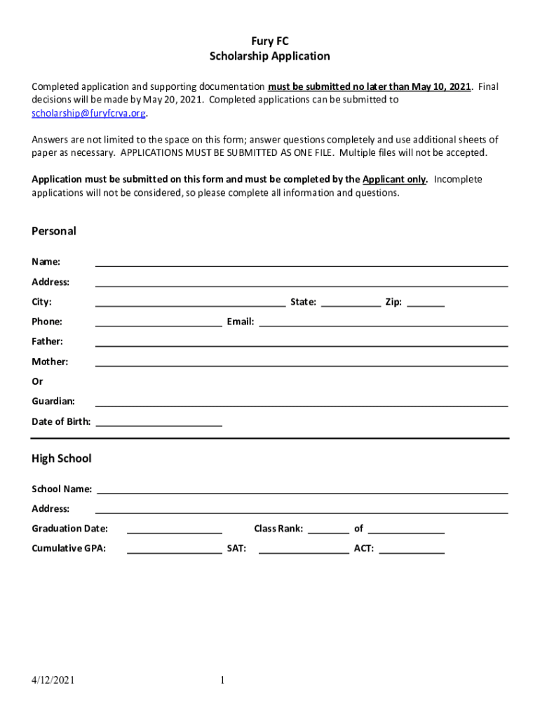 Fury FC Scholarship Application Completed application and supporting documentation must be submitted no later than May 10, 2021. Final decisions will be made by May 20, 2021. Completed applications