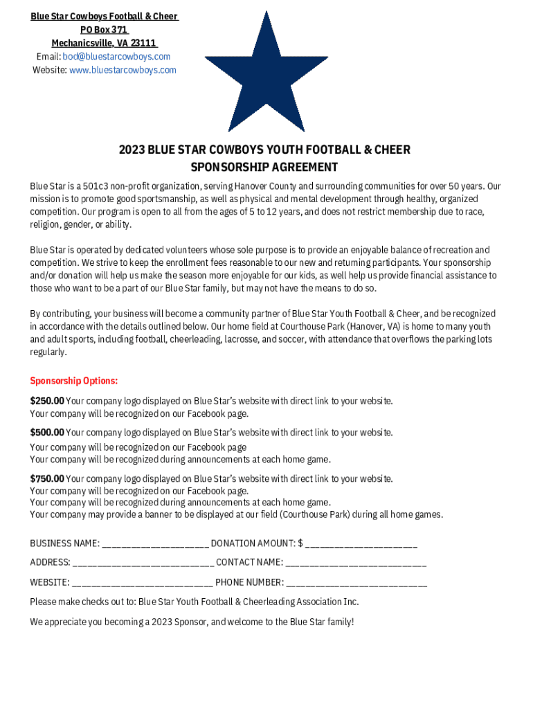Blue Star Cowboys Football & Cheer PO Box 371 Mechanicsville, VA 23111 Email: bod@bluestarcowboys.com Website: www.bluestarcowboys.com2023 BLUE STAR COWBOYS YOUTH FOOTBALL & CHEER SPONSORSHIP AGREEMENT