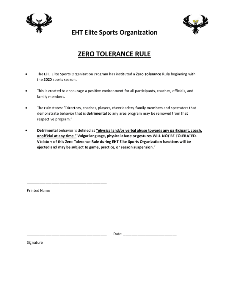 EAT Elite Sports OrganizationZERO TOLERANCE RULE The EAT Elite Sports Organization Program has instituted a Zero Tolerance Rule beginning with the 2020 sports season. This is created to encourage
