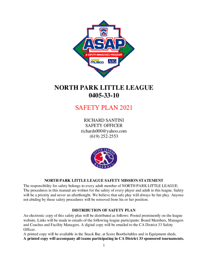 NORTH PARK LITTLE LEAGUE 04053310 SAFETY PLAN 2021 RICHARD SANTINO SAFETY OFFICER richards000@yahoo.com (619) 2522553NORTH PARK LITTLE LEAGUE SAFETY MISSION STATEMENT The responsibility for safety
