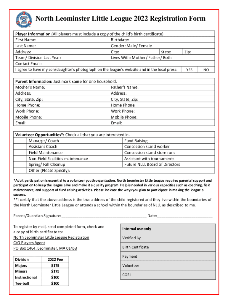 North Leominster Little League 2022 Registration Form Player Information (All players must include a copy of the child\'s birth certificate) First Name: Birthdate: Last Name: Gender: Male/ Female