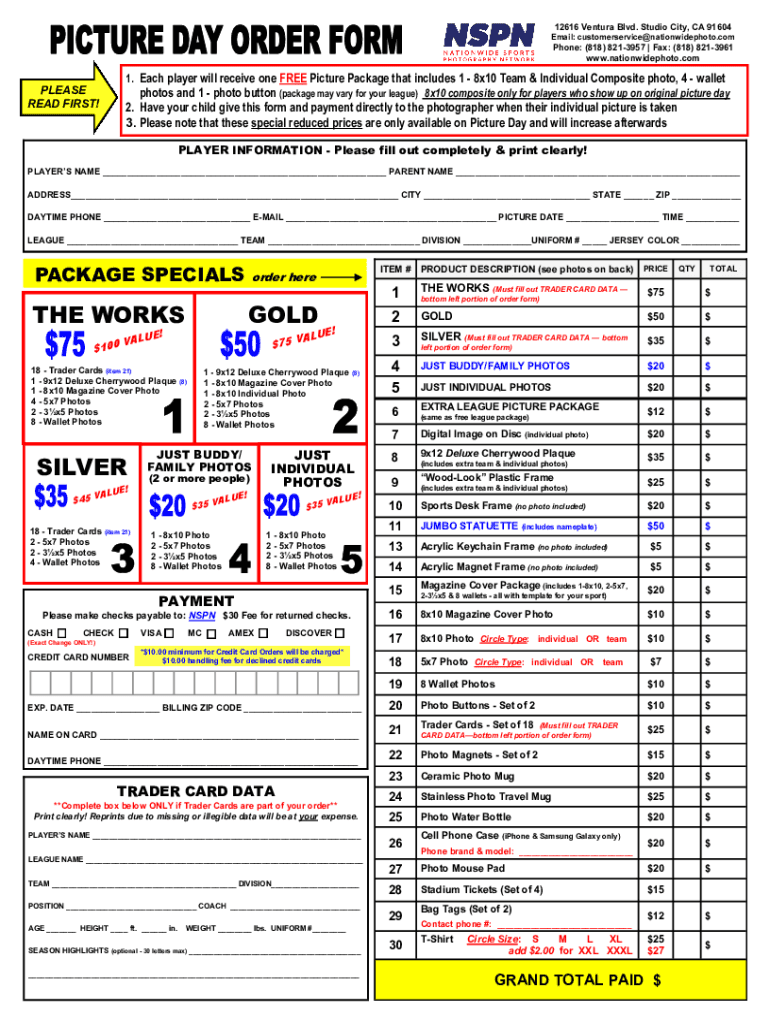 12616 Ventura Blvd. Studio City, CA 91604 Email: customerservice@nationwidephoto.comPhone: (818) 8213957 | Fax: (818) 8213961 www.nationwidephoto.com1. Each player will receive one FREE Picture Package