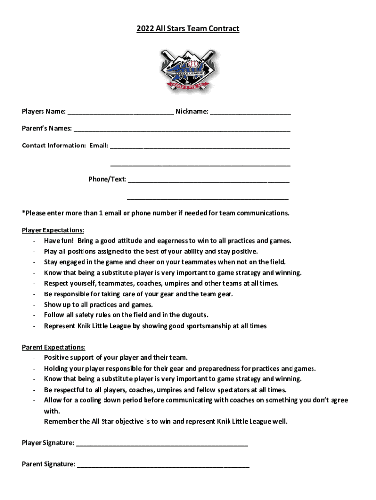 2022 All Stars Team ContractPlayers Name: ___ Nickname: ___ Parents Names: ___ Contact Information: Email: ___ ___ Phone/Text: ___ ___ *Please enter more than 1 email or phone number if needed for