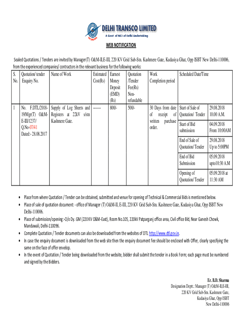 WEB NOTIFICATION Sealed Quotations / Tenders are invited by Manager(T) OMIT, III, 220 KV Grid Subs tn. Kashmir Gate, Eurasia Ghat, Opp ISBN New Delhi110006, from the experienced companies/ contractors