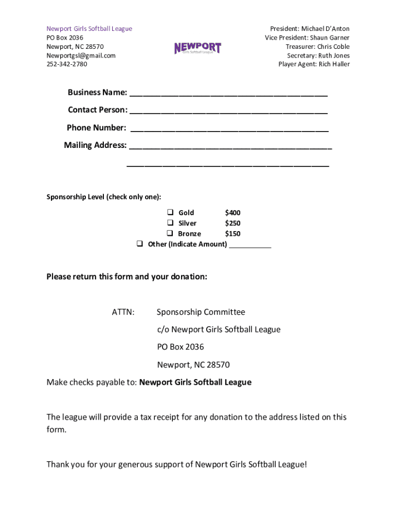 Newport Girls Softball League PO Box 2036 Newport, NC 28570 Newportgsl@gmail.com 2523422780President: Michael Danton Vice President: Shaun Garner Treasurer: Chris Cable Secretary: Ruth Jones Player