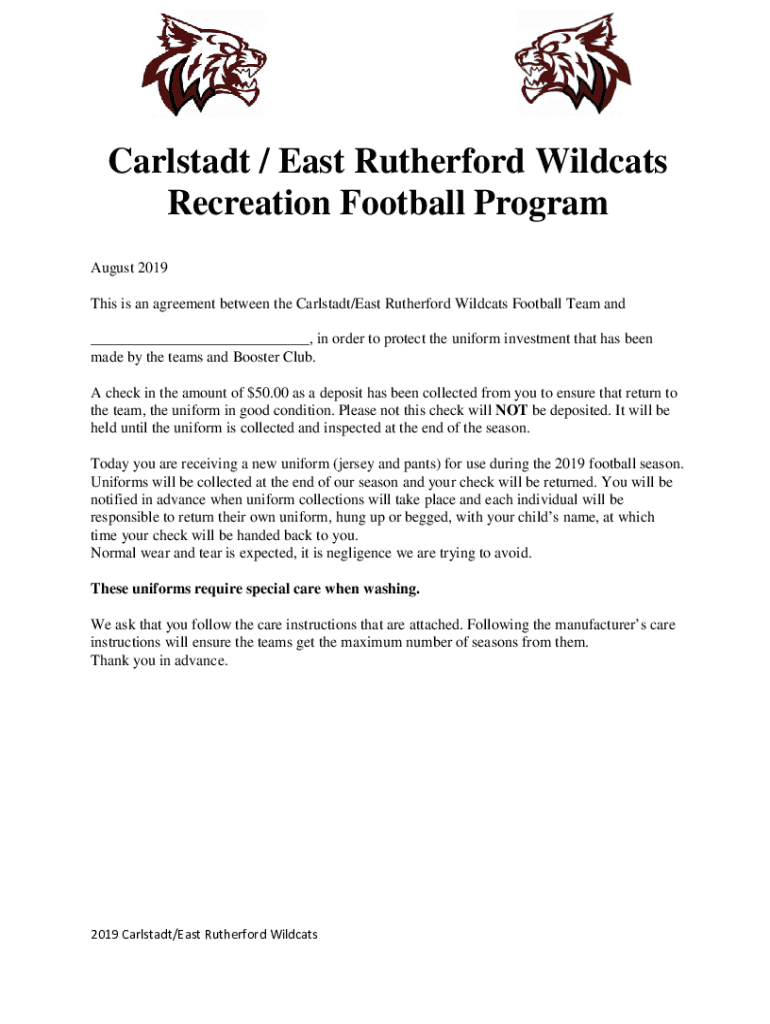 Carlsbad / East Rutherford Wildcats Recreation Football Program August 2019 This is an agreement between the Carlsbad/East Rutherford Wildcats Football Team and ___, in order to protect the uniform