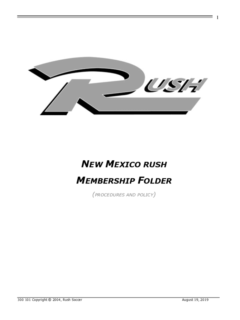 1NEW MEXICO RUSH MEMBERSHIP FOLDER (PROCEDURES AND POLICY)300 101 Copyright 2004, Rush Soccer August 19, 20192MANAGERS FOLDER TABLE OF CONTENTS Managers Welcome Letter ___ 3 Organizational Overview___