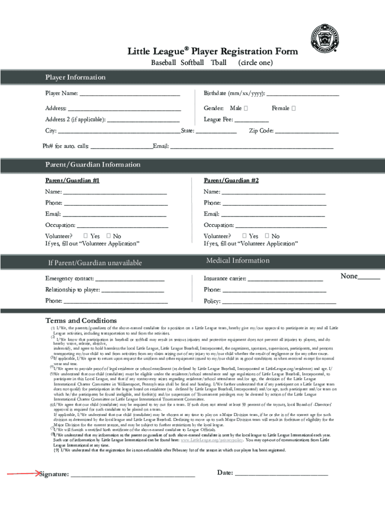 Little League Player Registration Form Baseball Softball Ball(circle one)Player Information Player Name: ___Birthdate (mm/xx/YYY): ___Address: ___Gender:Address 2 (if applicable): ___League Fee: ___Salacity: