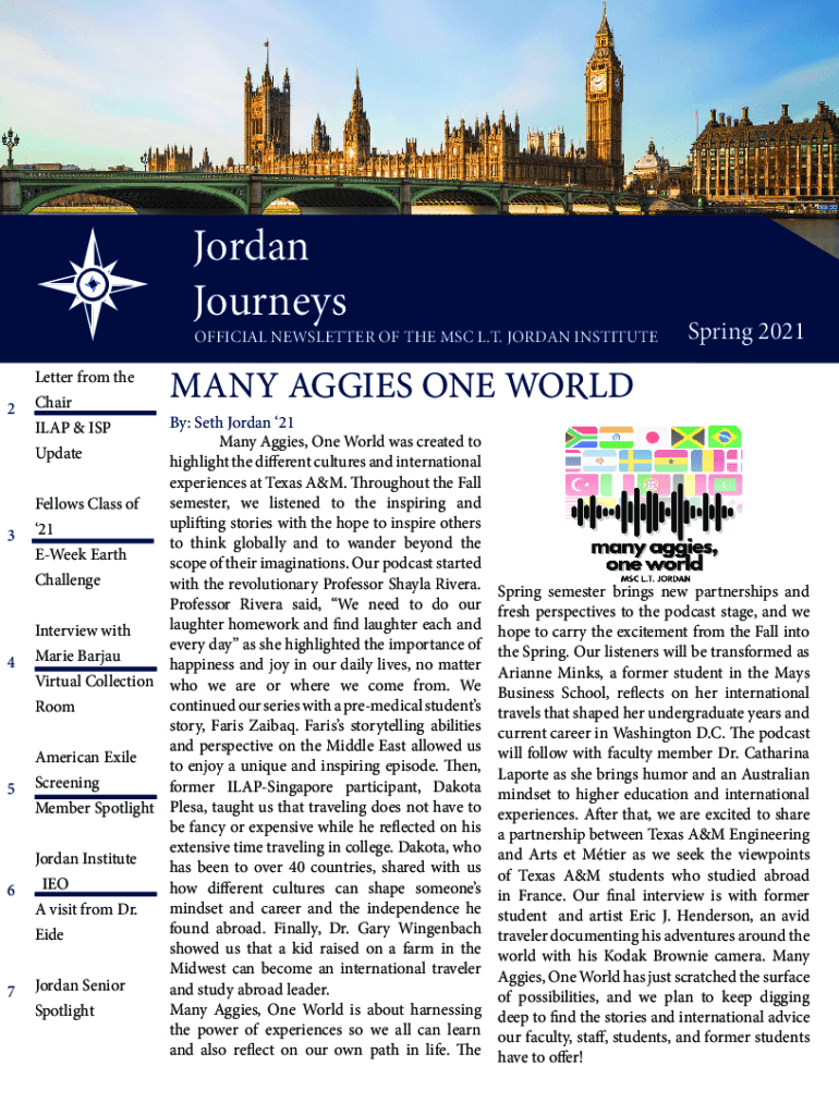 Jordan JourneysOFFICIAL NEWSLETTER OF THE MSC L.T. JORDAN INSTITUTELetter from the 234567Chair LAP & ISP UpdateSpring 2021MANY AGGIE ONE Worldly: Seth Jordan 21Many Aggie's, One World was created