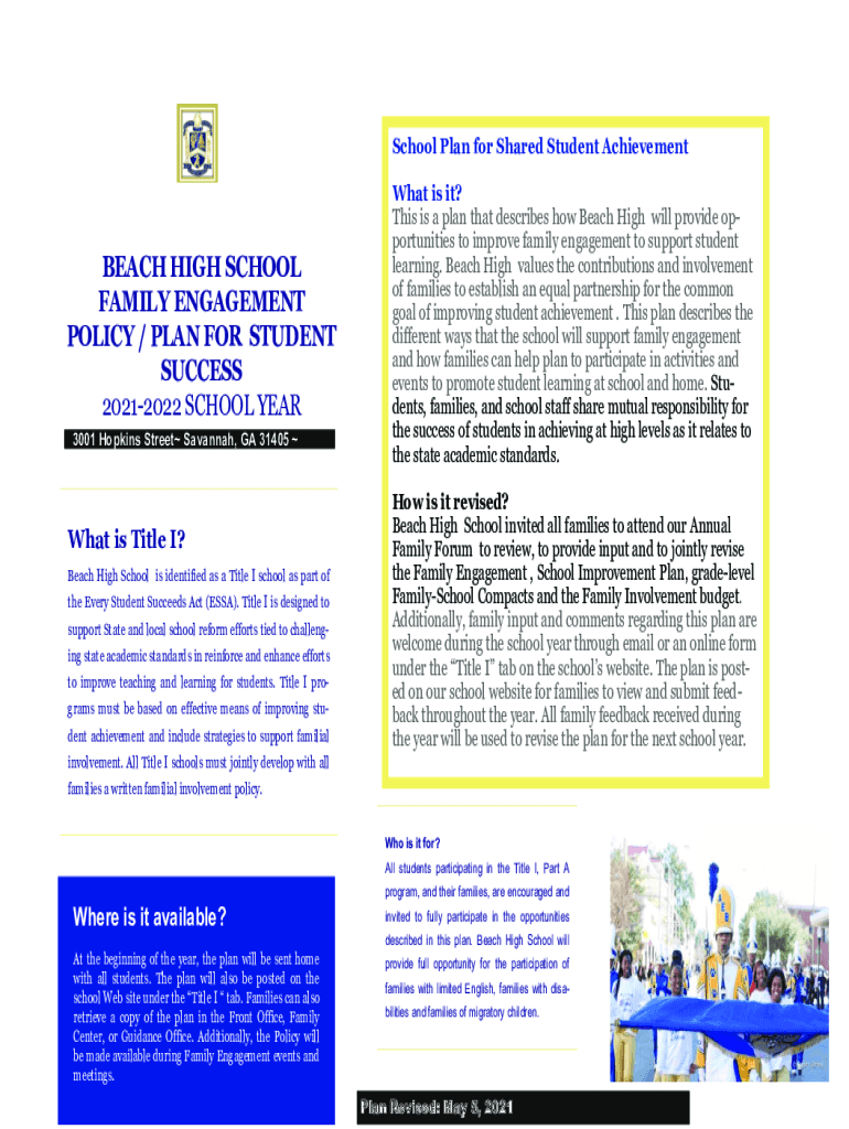 School Plan for Shared Student AchievementBEACH HIGH SCHOOL FAMILY ENGAGEMENT POLICY / PLAN FOR STUDENT SUCCESS 20212022 SCHOOL YEAR 3001 Hopkins Street Savannah, GA 31405 What is Title I? Beach High