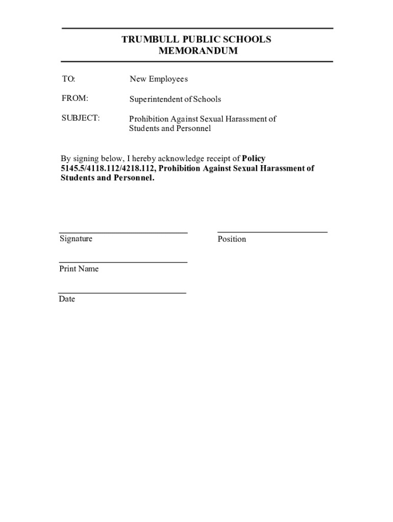 TO:New EmployeesFROM:Superintendent of SchoolsSUBJECT:Prohibition Against Sexual Harassment of