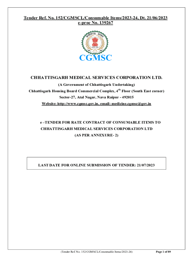 Tender Ref. No. 152/COMIC/Consumable Items/202324, DT. 21/06/2023 EPROM No. 139267CHHATTISGARH MEDICAL SERVICES CORPORATION LTD. (A Government of Chhattisgarh Undertaking) Chhattisgarh Housing Board