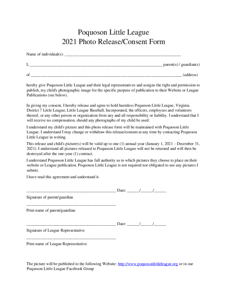 Get the free Poquoson Little League 2021 Photo Release/Consent Form
