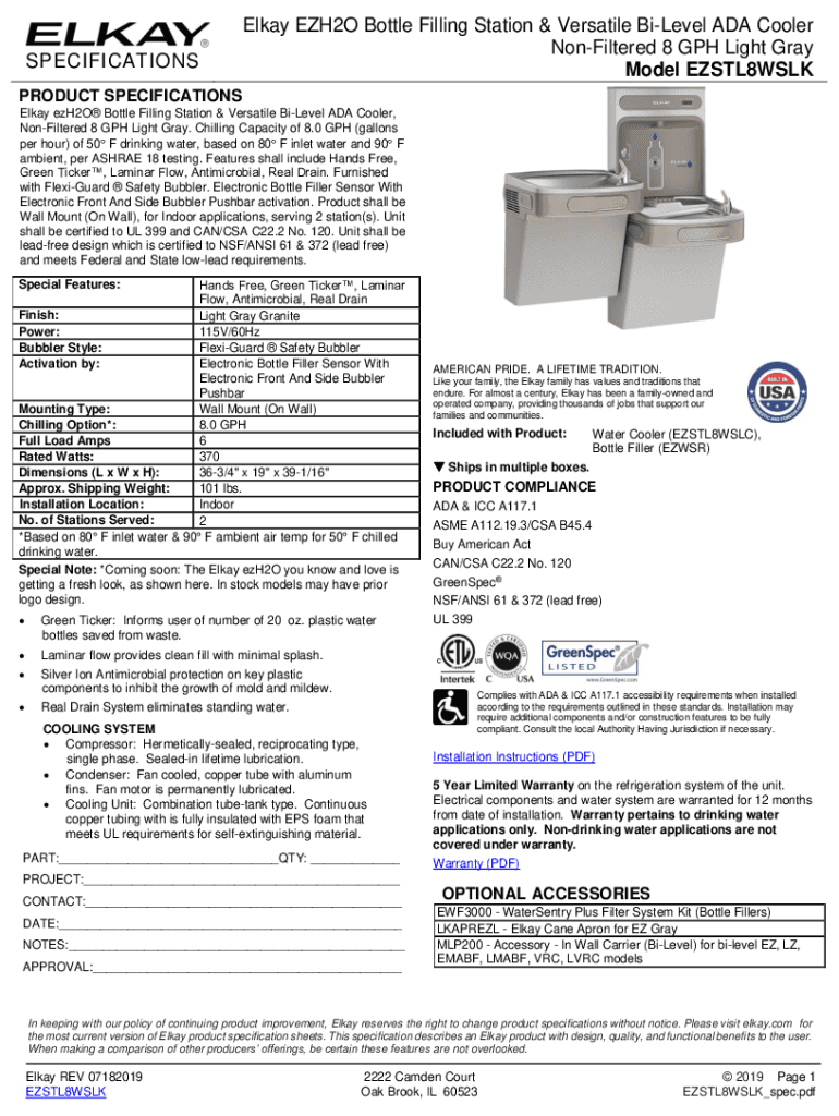 SPECIFICATIONSElkay EZH2O Bottle Filling Station & Versatile Level ADA Cooler Unfiltered 8 MPH Light Gray Model EZSTL8WSLKPRODUCT SPECIFICATIONS Elway ezH2O Bottle Filling Station & Versatile Level