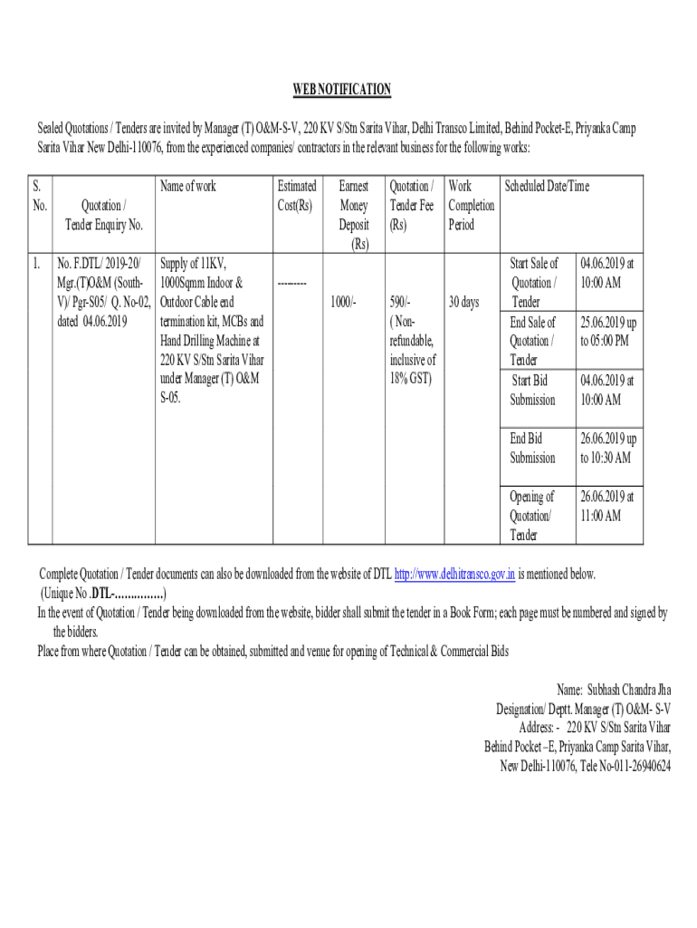 WEB NOTIFICATION Sealed Quotations / Tenders are invited by Manager (T) O&M SV, 220 KV S/STN Sari ta Vicar, Delhi Transco Limited, Behind Pocket, Priyanka Camp Sari ta Vicar New Delhi110076, from