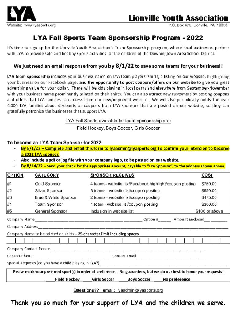 Liouville Youth Association Website: www.lyasports.orgP. O. Box 475, Liouville, PA 19353LYA Fall Sports Team Sponsorship Program 2022 It's time to sign up for the Liouville Youth Associations Team