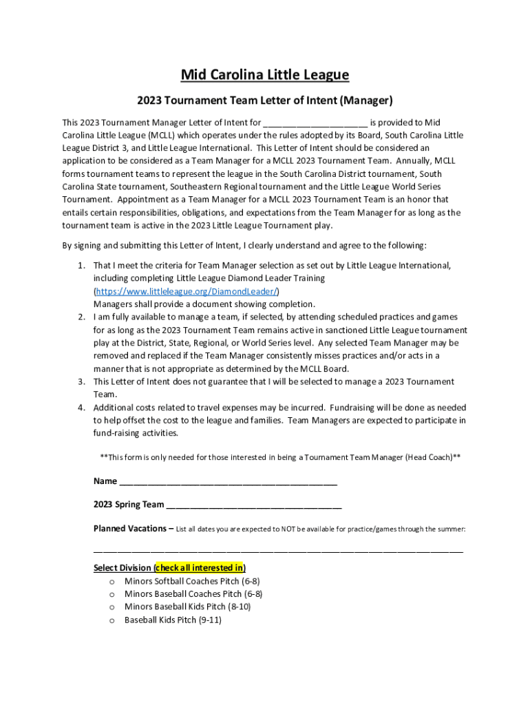 Mid-Carolina Little League 2023 Tournament Team Letter of Intent (Manager) This 2023 Tournament Manager Letter of Intent for ___ is provided to Mid-Carolina Little League (MALL) which operates under