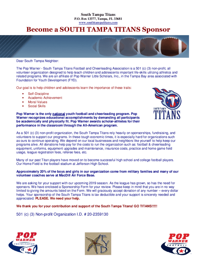 South Tampa Titans P.O. Box 13377, Tampa, FL 33681 www.southtampatitans.comBecome a SOUTH TAMPA TITANS Sponsored South Tampa Neighbor: The Pop Warner South Tampa Titans Football and Cheerleading Association