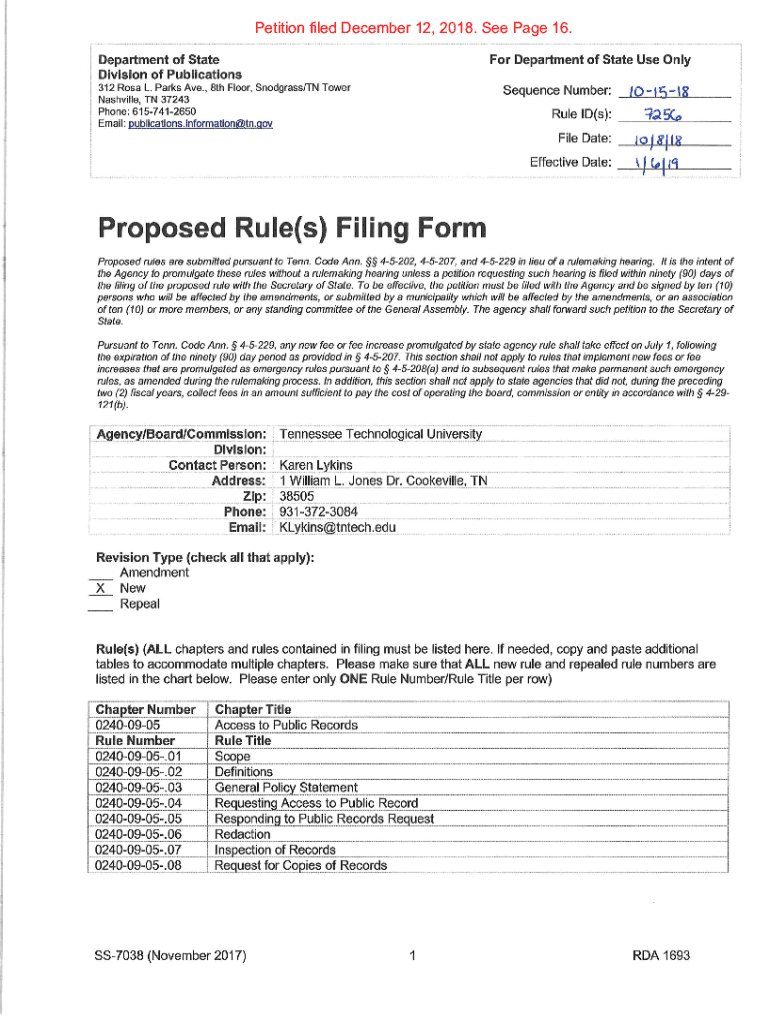Petition filed December 12, 2018. See Page 16. For Department of State Use OnlyDepartment of State Division of Publications I312 Rosa L. Parks Ave., 8th Floor, Snodgrass/TN Tower Nashville, TN 37243