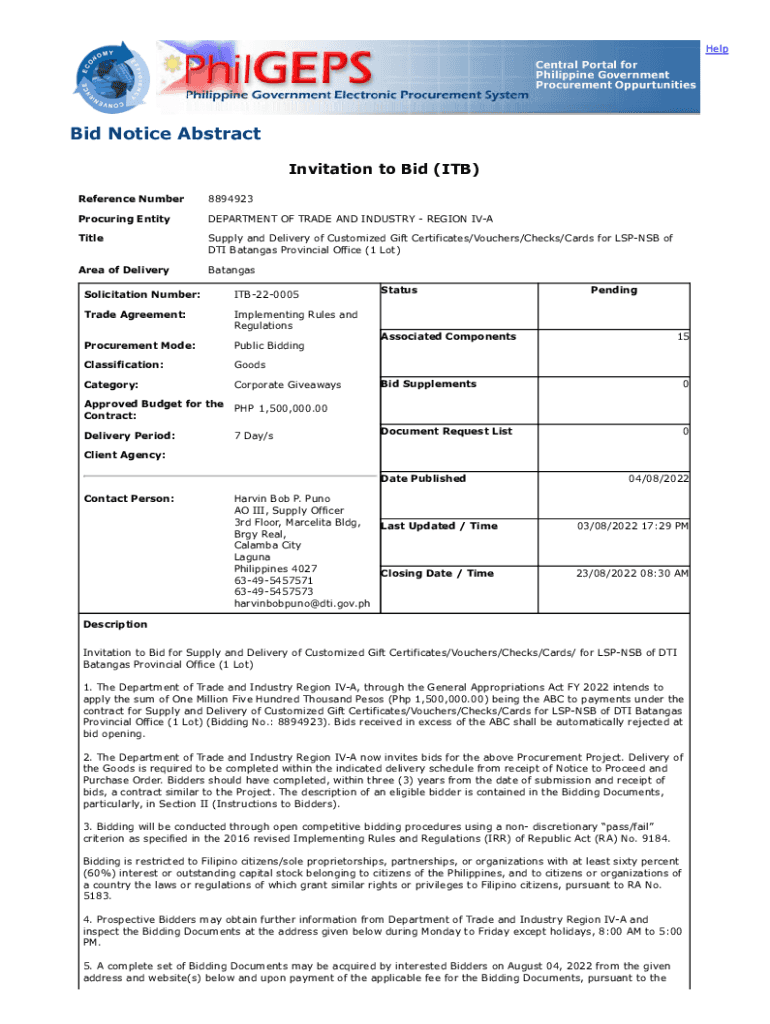 Reference Number8894923Procuring EntityDEPARTMENT OF TRADE AND INDUSTRY REGION IVATitleSupply and Delivery of Customized Gift Certificates/Vouchers/Checks/Cards