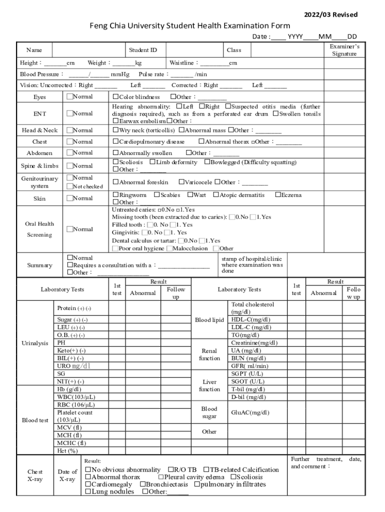 2022/03 RevisedFeng Chia University Student Health Examination Form