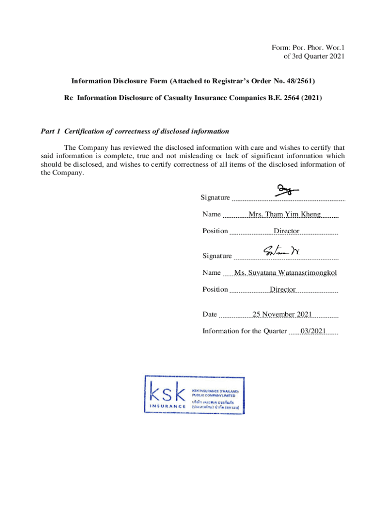 Form: POR. Poor. For.1 of 3rd Quarter 2021 Information Disclosure Form (Attached to Registrars Order No. 48/2561) Re Information Disclosure of Casualty Insurance Companies B.E. 2564 (2021)Part 1 Certification