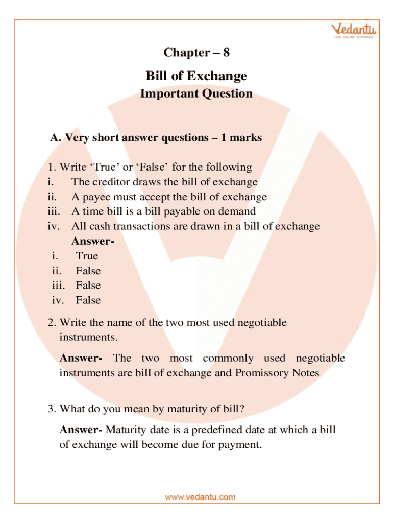Chapter 8Bill of Exchange Important Question. Very short answer questions 1 marks 1. Write True or False for the following i. The creditor draws the bill of exchange ii. A payee must accept the bill