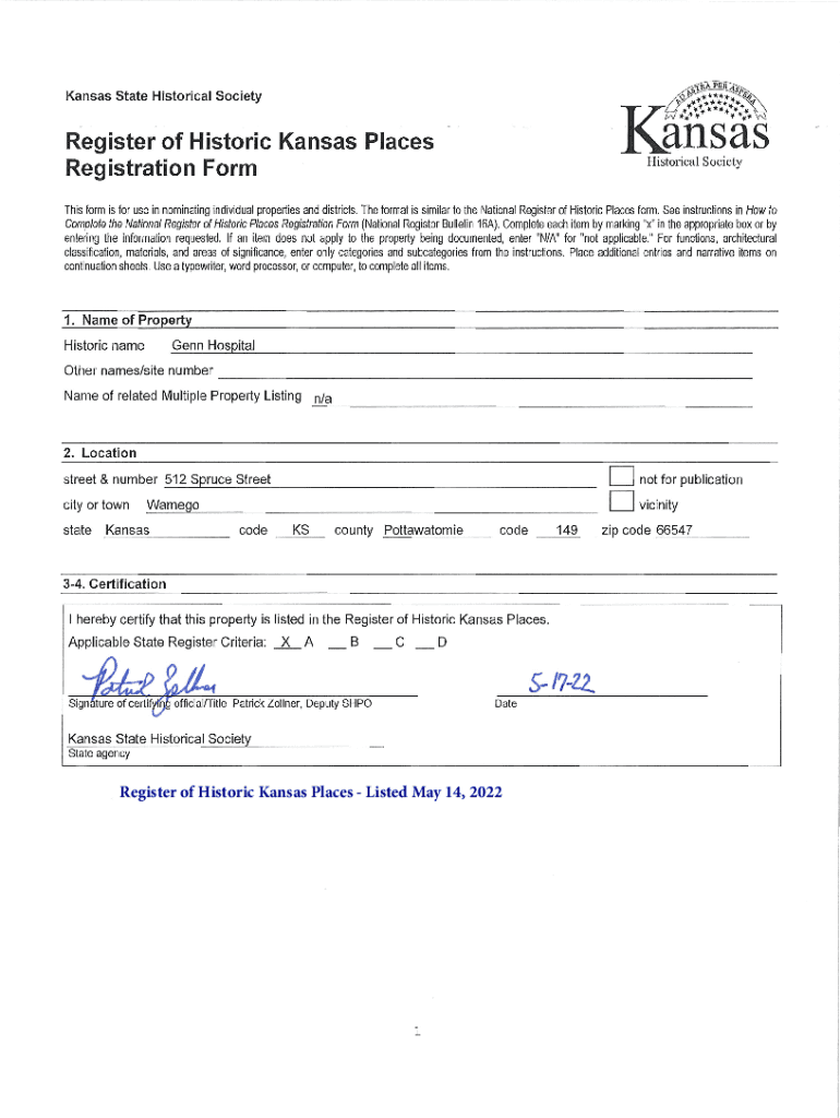 Register of Historic Kansas Places Listed May 14, 2022Genn HospitalWamego, Pottawatomie Co. Name of PropertyCity and County5. Classification