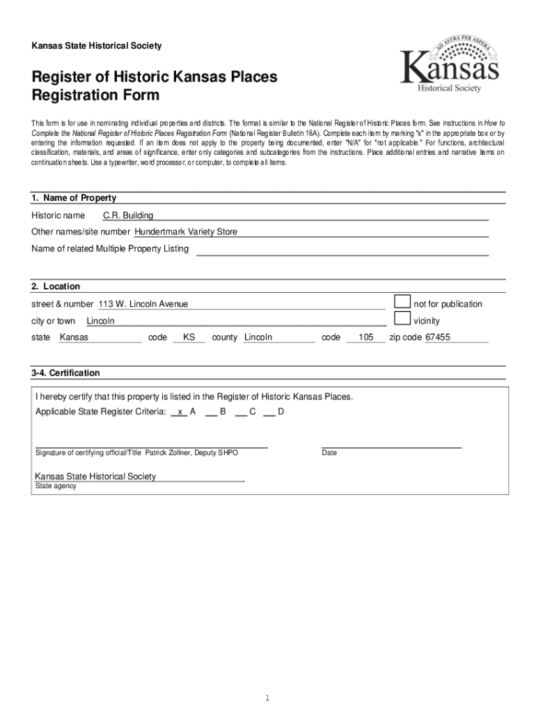 Kansas State Historical SocietyRegister of Historic Kansas Places Registration Form This form is for use in nominating individual properties and districts. The format is similar to the National Register