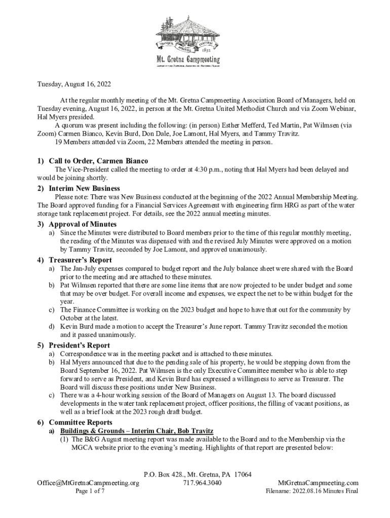 Tuesday, August 16, 2022, At the regular monthly meeting of the Mt. Greta Camp meeting Association Board of Managers, held on Tuesday evening, August 16, 2022, in person at the Mt. Greta United Methodist