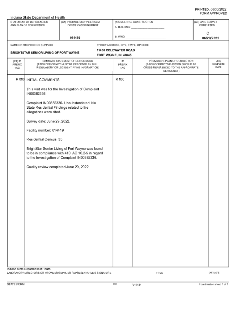 PRINTED: 06/30/2022 FORM APPROVED Indiana State Department of Health STATEMENT OF DEFICIENCIES AND PLAN OF CORRECTION(X1) PROVIDER/SUPPLIER/CIA IDENTIFICATION NUMBER:BRIGHT STAR SENIOR LIVING OF FORT