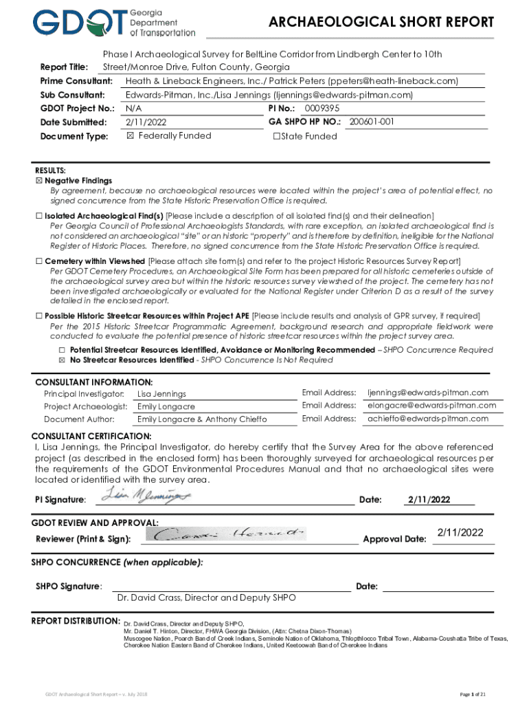 GDQTGeorgia Department of TransportationReport Title:ARCHAEOLOGICAL SHORT Reportage I Archaeological Survey for Bellini Corridor from Lindbergh Center to 10th Street/Monroe Drive, Fulton County, GeorgiaPrime