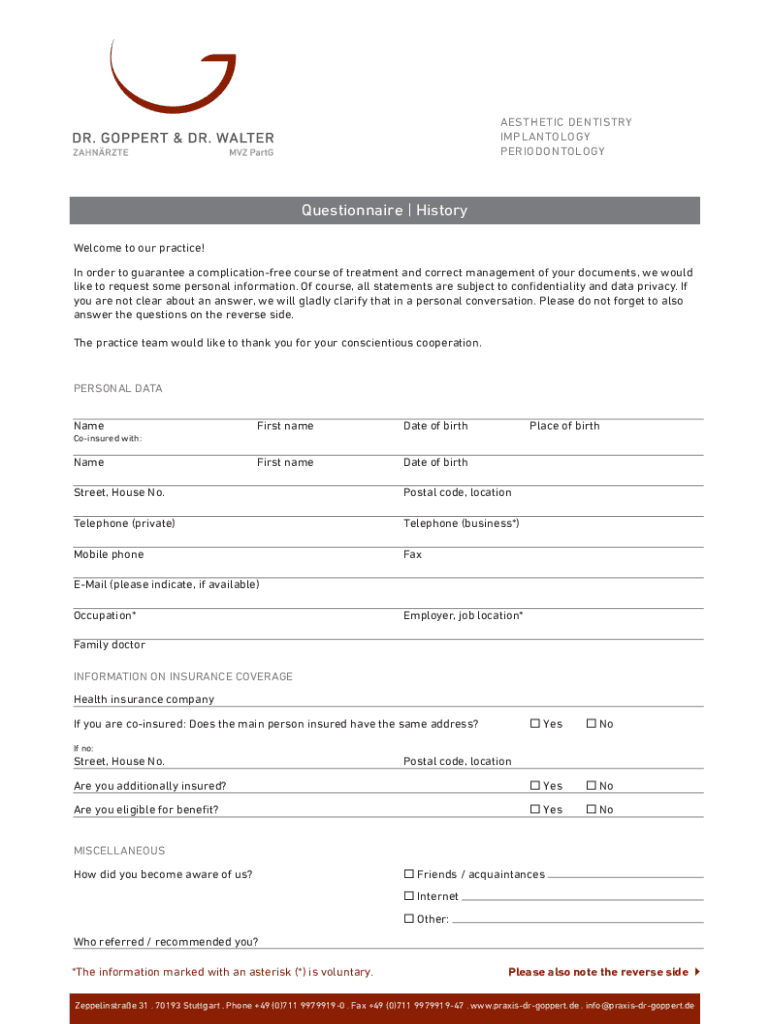AESTHETIC DENTISTRY IMPLANTOLOGY PERIODONTOLOGYQuestionnaire | History Welcome to our practice! In order to guarantee a complication free course of treatment and correct management of your documents,