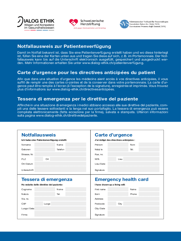 Ottieni il gratuito Notfallausweis zur Patientenverfgung Carte d'urgence pour les ...