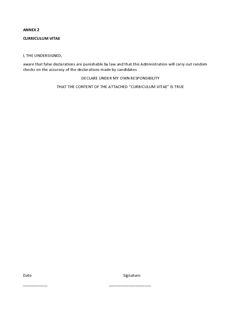 ANNEX 2 CURRICULUM VITAE, THE UNDERSIGNED, aware that false declarations are punishable by law and that this Administration will carry out random checks on the accuracy of the declarations made by