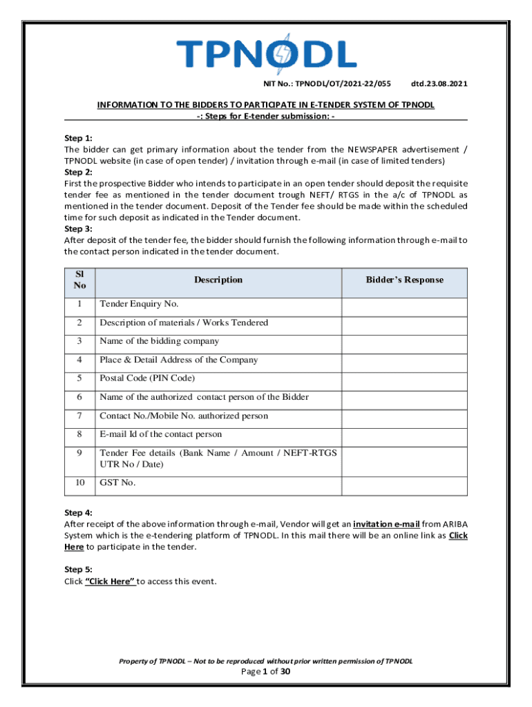 NIT No.: TEND/OT/202122/055dtd.23.08.2021INFORMATION TO THE BIDDERS TO PARTICIPATE IN TENDER SYSTEM OF TEND