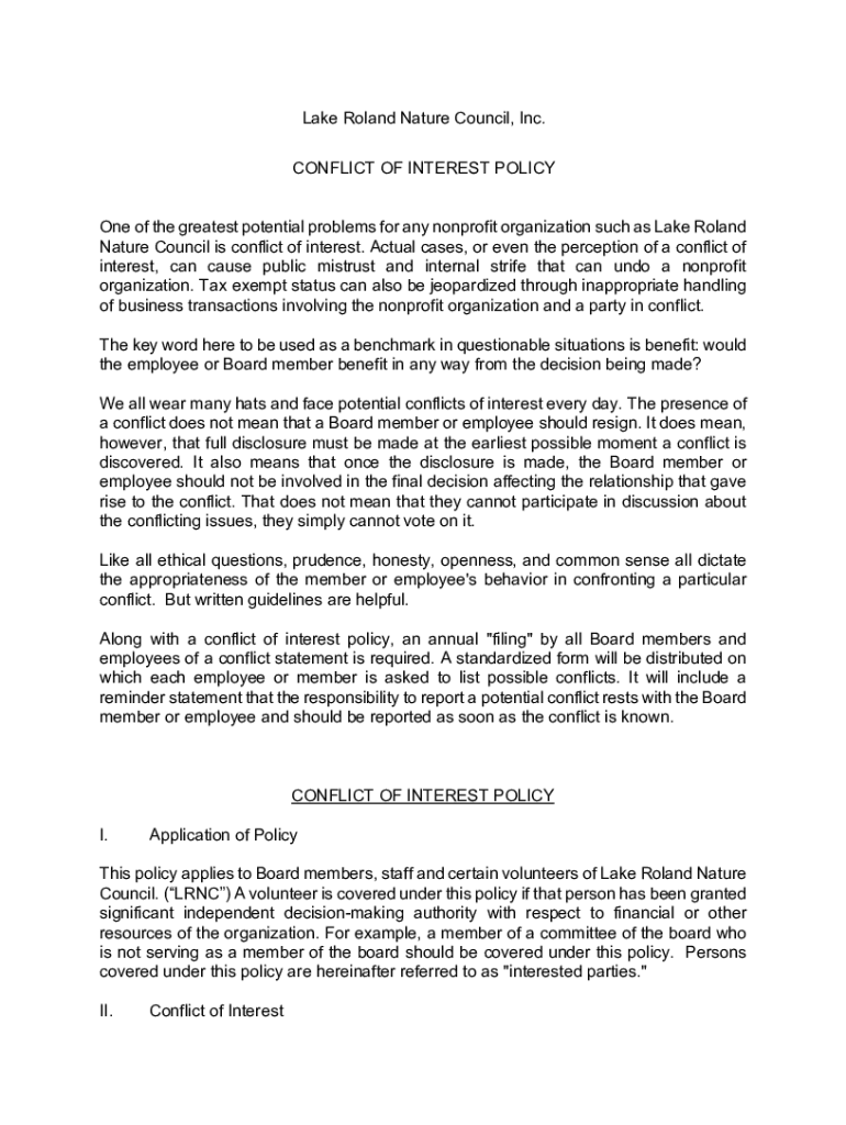 Lake Roland Nature Council, Inc. CONFLICT OF INTEREST POLICY One of the greatest potential problems for any nonprofit organization such as Lake Roland Nature Council is conflict of interest. Actual