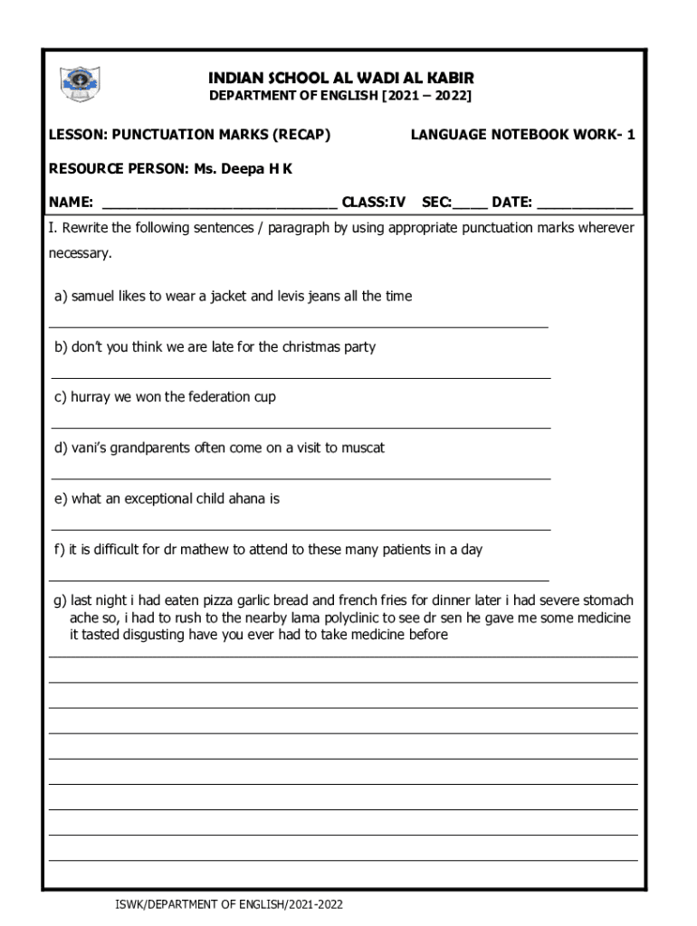INDIAN SCHOOL AL WADI AL AIR DEPARTMENT OF ENGLISH [2021 2022]LESSON: PUNCTUATION MARKS (RECAP)LANGUAGE NOTEBOOK WORK 1RESOURCE PERSON: Ms. Deep H K NAME: ___ CLASS:IV SEC:___ DATE: ___I. Rewrite