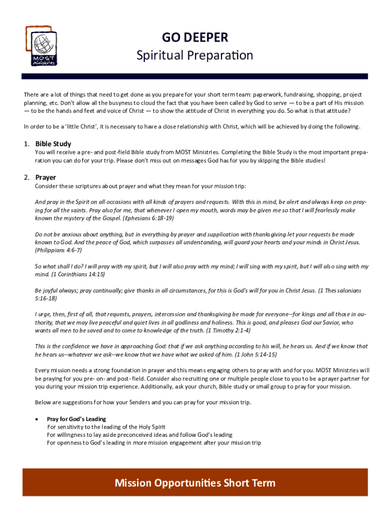 GO DEEPER Spiritual Preparation There are a lot of things that need to get done as you prepare for your short term team: paperwork, fundraising, shopping, project planning, etc. Don't allow all the