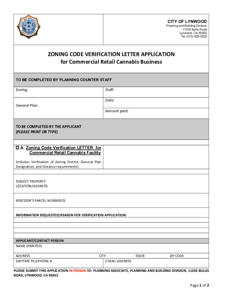 CITY OF LYNWOODPlanning and Building Division 11330 Bulls Road Lynwood, CA 90262 Tel (310) 6030220ZONING CODE VERIFICATION LETTER APPLICATION for Commercial Retail Cannabis Business TO BE COMPLETED