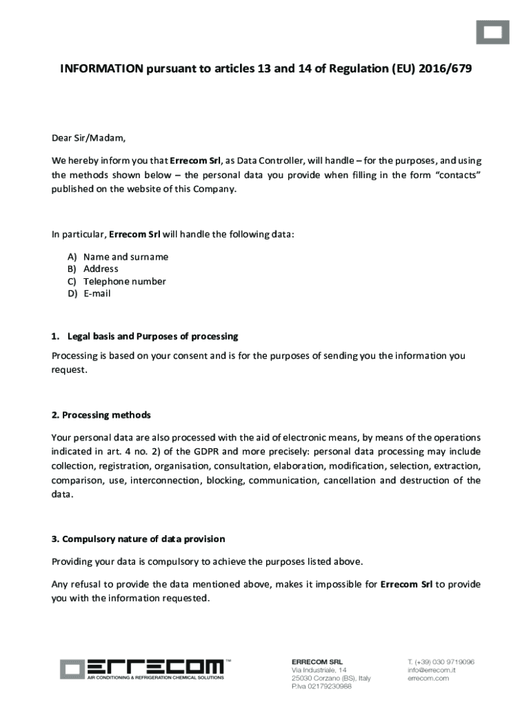 INFORMATION pursuant to articles 13 and 14 of Regulation (EU) 2016/679Dear Sir/Madam, We hereby inform you that Freedom NRL, as Data Controller, will handle for the purposes, and using the methods