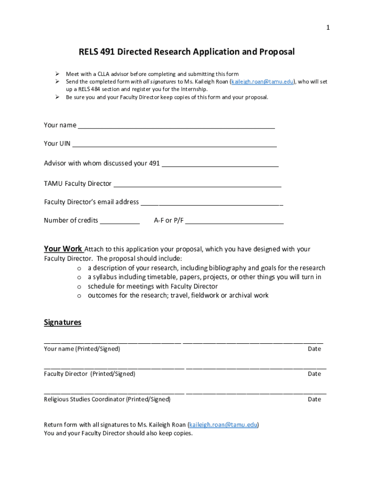 1RELS 491 Directed Research Application and Proposal Meet with a ELLA advisor before completing and submitting this form Send the completed form with all signatures to Ms. Kayleigh Roan (kaileigh.roan@tamu.edu),