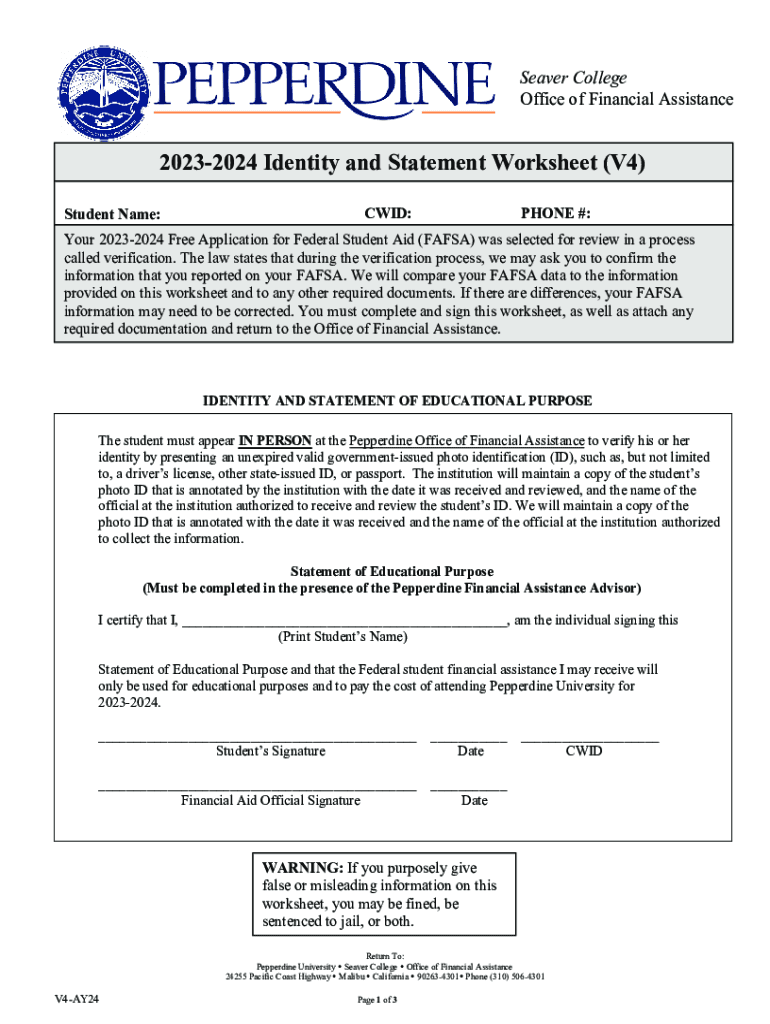 Server College Office of Financial Assistance20232024 Identity and Statement Worksheet (V4) Student Name:CID:PHONE #:Your 20232024 Free Application for Federal Student Aid (FAFSA) was selected for