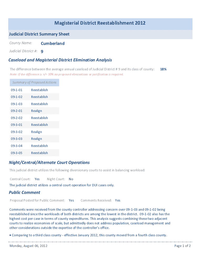Magisterial District Reestablishment 2012 Judicial District Summary Sheet County Name:CumberlandJudicial District #: 9Caseload and Magisterial District Elimination Analysis The difference between