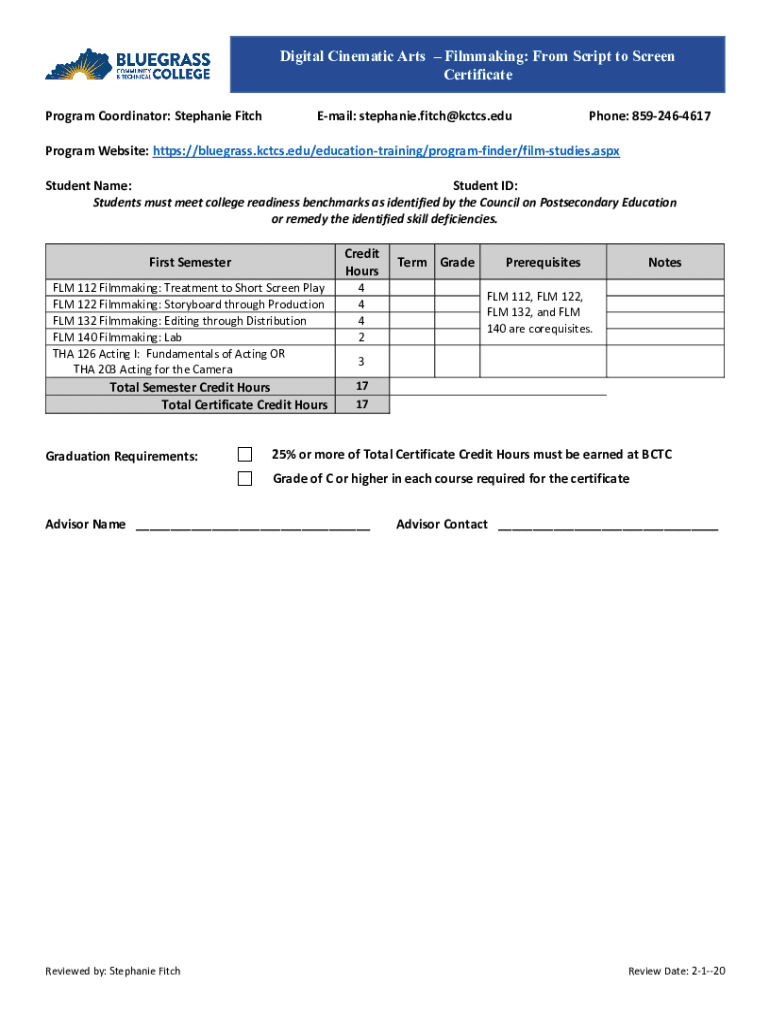 Digital Cinematic Arts Filmmaking: From Script to Screen Certificate Program Coordinator: Stephanie FitchEmail: stephanie.fitch@kctcs.eduPhone: 8592464617Program Website: https://bluegrass.kctcs.edu/educationtraining/programfinder/filmstudies.aspx