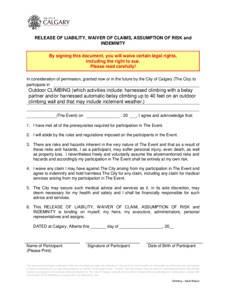 RELEASE OF LIABILITY, WAIVER OF CLAIMS, ASSUMPTION OF RISK and INDEMNITY By signing this document, you will waive certain legal rights, including the right to sue. Please read carefully! In consideration