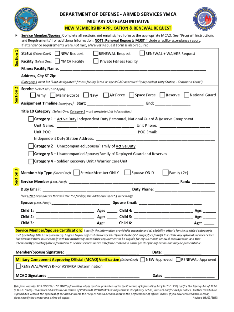DEPARTMENT OF DEFENSE ARMED SERVICES YMCA MILITARY OUTREACH INITIATIVE NEW MEMBERSHIP APPLICATION & RENEWAL REQUESTSection 1Service Member/Spouse: Complete all sections and email signed form to the