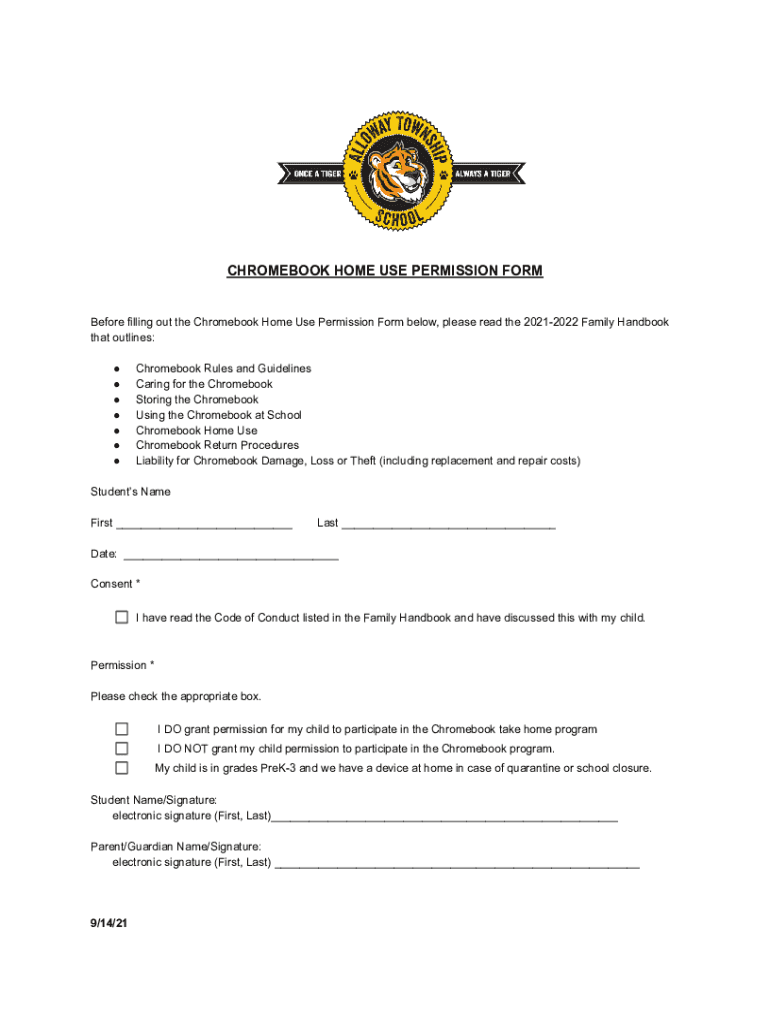 CHROMEBOOK HOME USE PERMISSION Forbore filling out the Chromebook Home Use Permission Form below, please read the 20212022 Family Handbook that outlines: Chromebook Rules and Guidelines Caring for